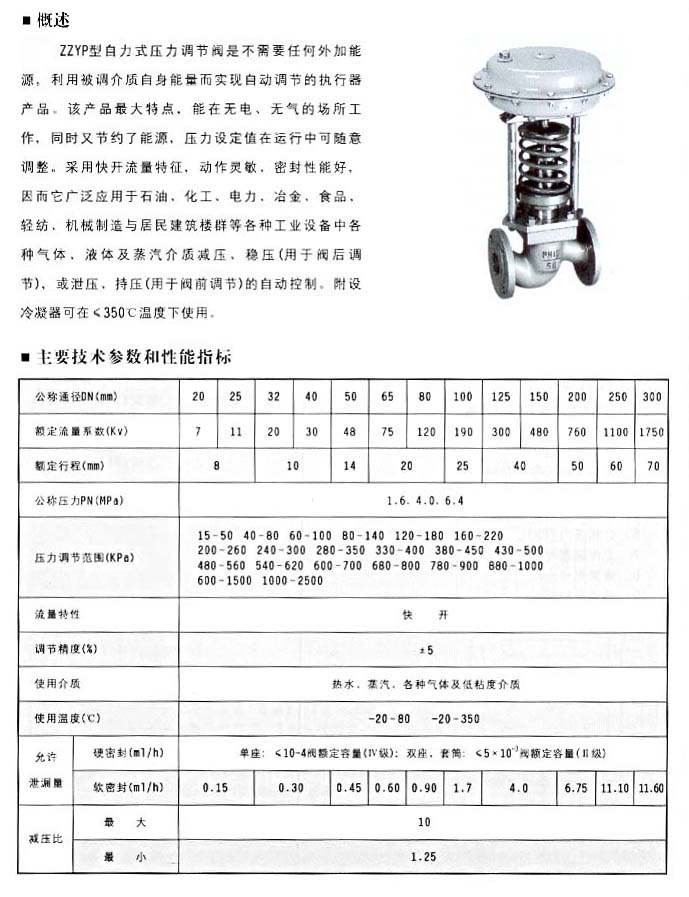 ZZYP型自力式壓力調(diào)節(jié)閥是不需要任何外加能源,利用被調(diào)介質(zhì)自身能量而實現(xiàn)自動調(diào)節(jié)的執(zhí)行器產(chǎn)品,該產(chǎn)品***大特點,能在無電、無氣的場所工作,同時又節(jié)約了能源,壓力設(shè)定值在運行中可隨意調(diào)整。采用快開流量特征,動作靈敏,密封性能好,因面它廣泛應用于石油、化工、電力、冶金、食品、輕紡、機械制造與居民建筑樓群等各種工業(yè)設(shè)備中各種氣體、液體及蒸汽介質(zhì)減壓、穩(wěn)壓(用于閥后調(diào)節(jié))、或泄壓、持壓(用于閥前調(diào)節(jié))的自動控制、附設(shè)冷凝器可在<350C溫度下使用。